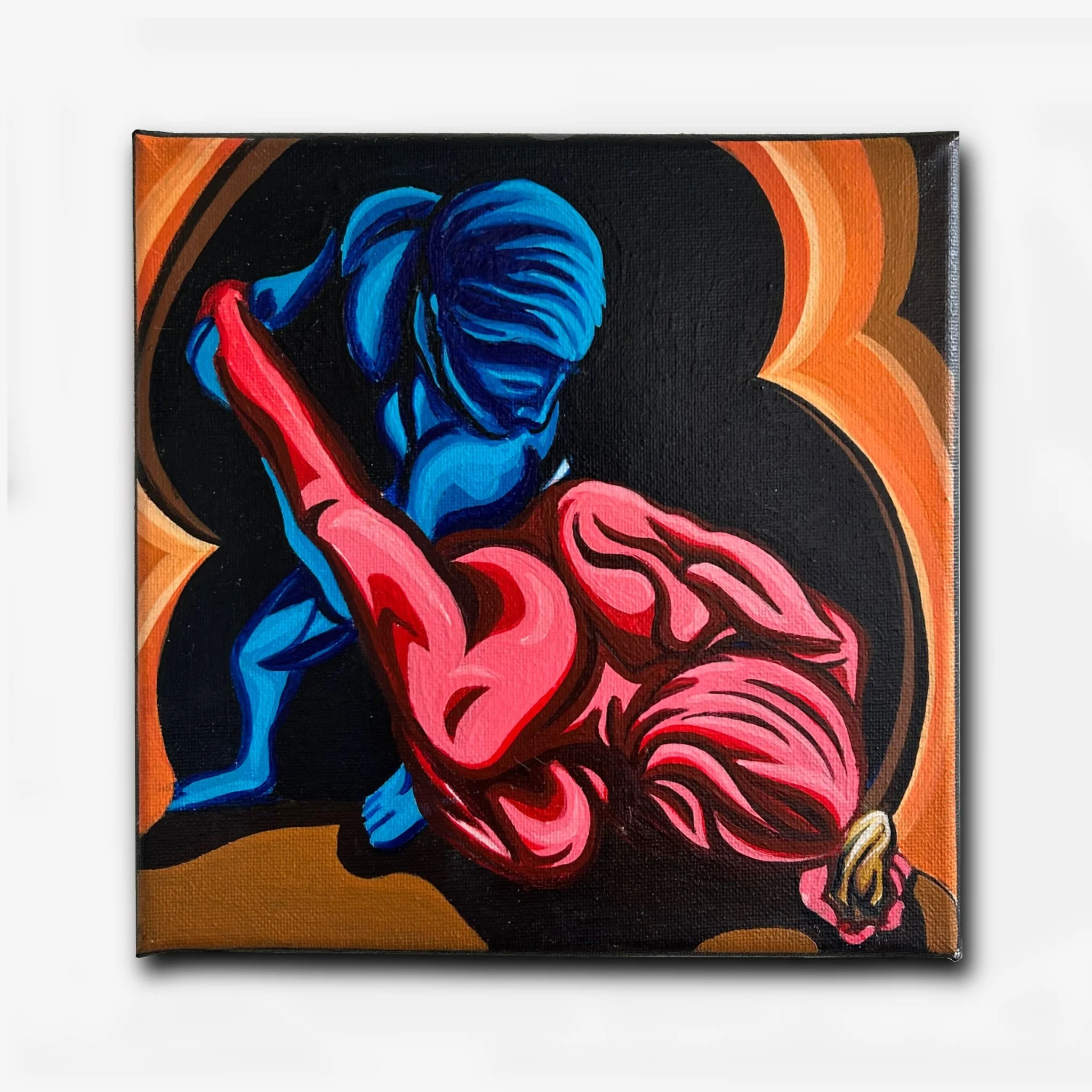 The figures in this work are intentionally stylized and divided through color. One body emerges in deep blue while the other burns in red, symbolizing opposing forces reason and emotion, restraint and impulse, victim and aggressor. Their intertwined forms suggest that conflict is rarely external alone; it exists just as powerfully within us.